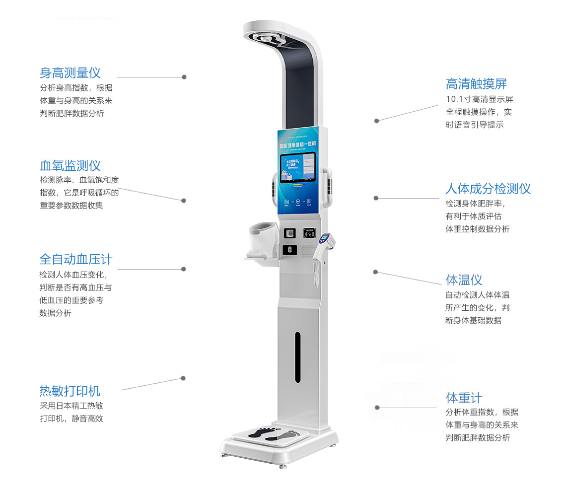 标配功能:身高、体重、BMI、体温、血压、脉率、人体脂肪、血氧、视力、中医。